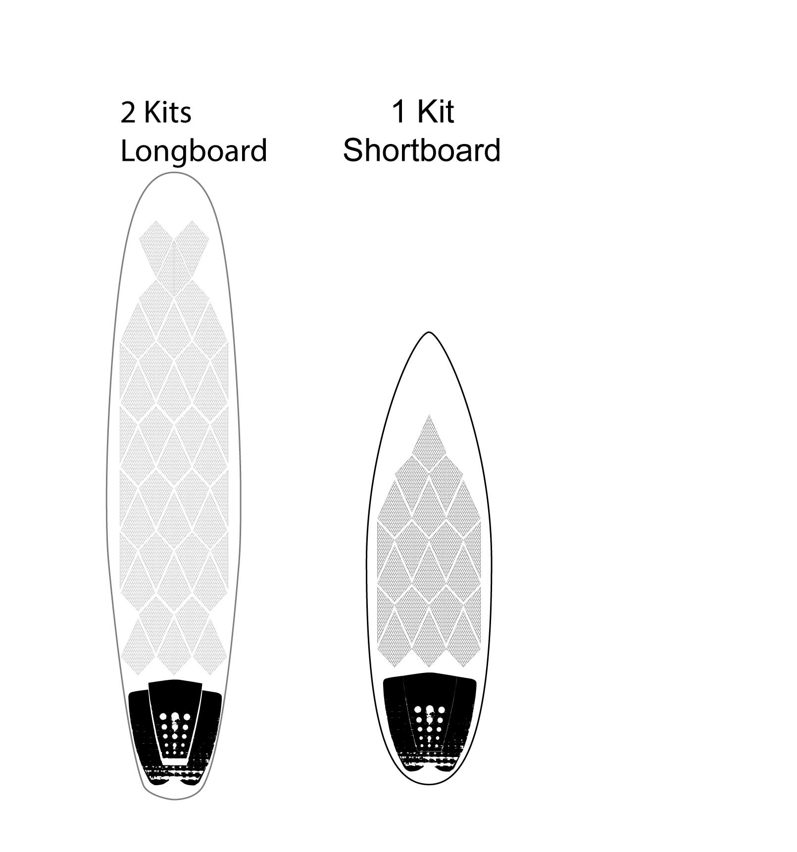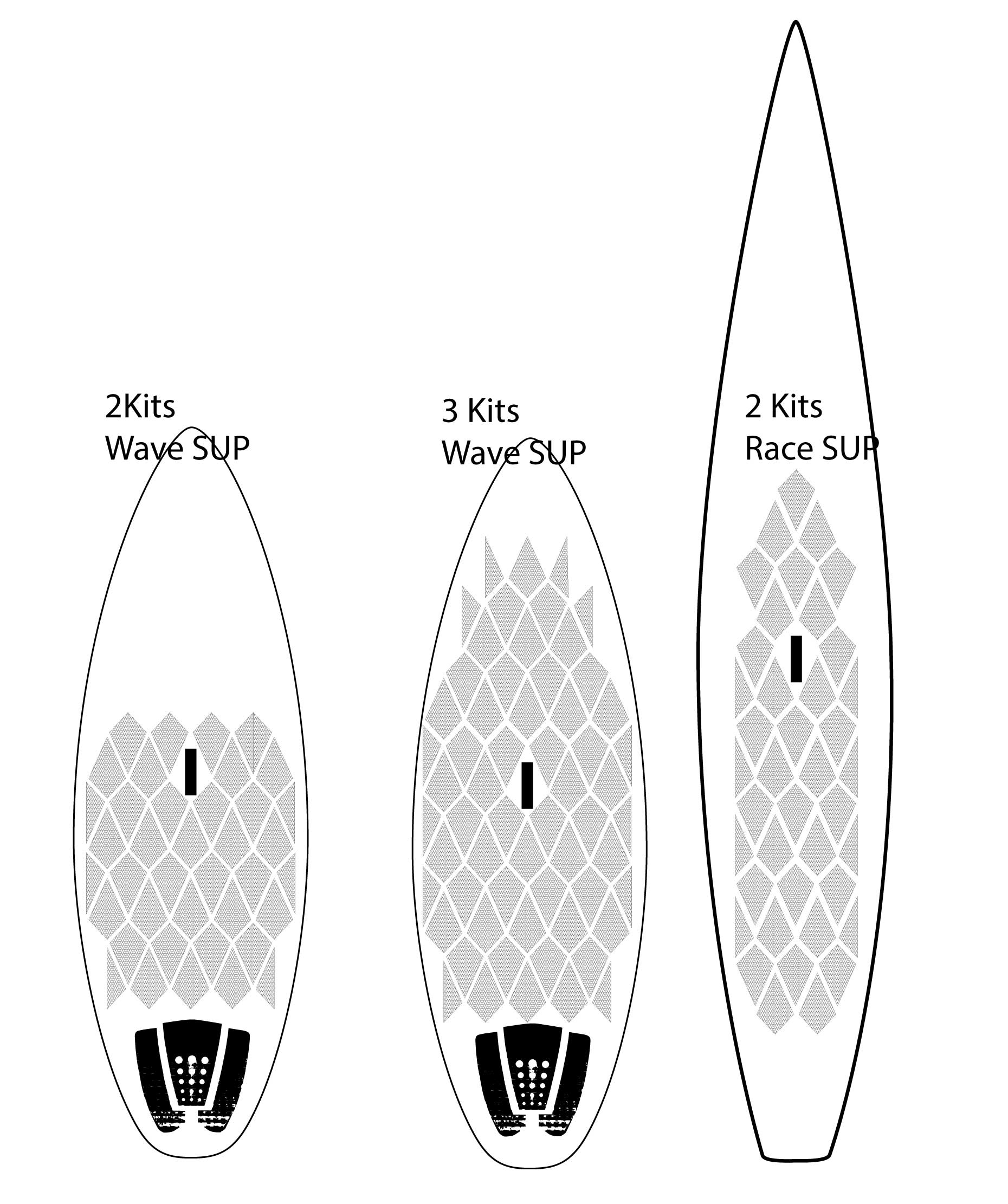 - Fun boards and Long boards: 2 standard kits (boxes) recommended. 3 for longer than 8′ boards. Check the image with layout examples.
